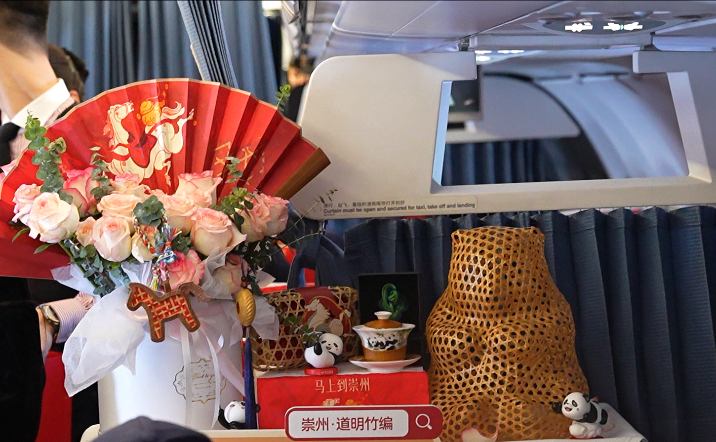 登机时,每位旅客都收到一份非遗伴手礼:内含竹编体验材料包、罨画池门票、华阳国志馆门票、陆游书签、崇州民宿打折券等12种不同领域的礼品。机组人员也为旅客送上春联、福字,与旅客共祈马年大吉、马到成功,瞬间营造出浓浓年味与文化氛围。