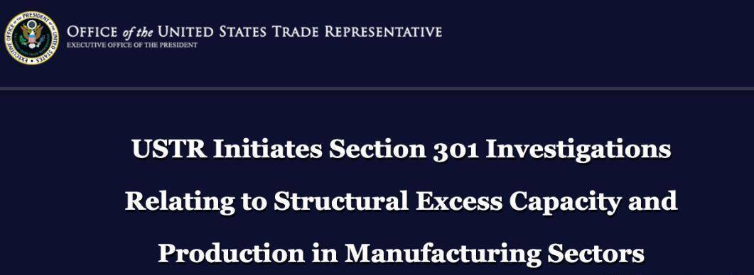 美国贸易代表杰米森·格里尔 (Jamieson Greer) 宣布,针对1974年《贸易法》第301(b)条下各经济体关于制造业结构性过剩产能和生产的行为、政策和做法展开调查。调查将确定这些行为、政策和做法是否不合理或具有歧视性,是否构成负担或限制美国商业。