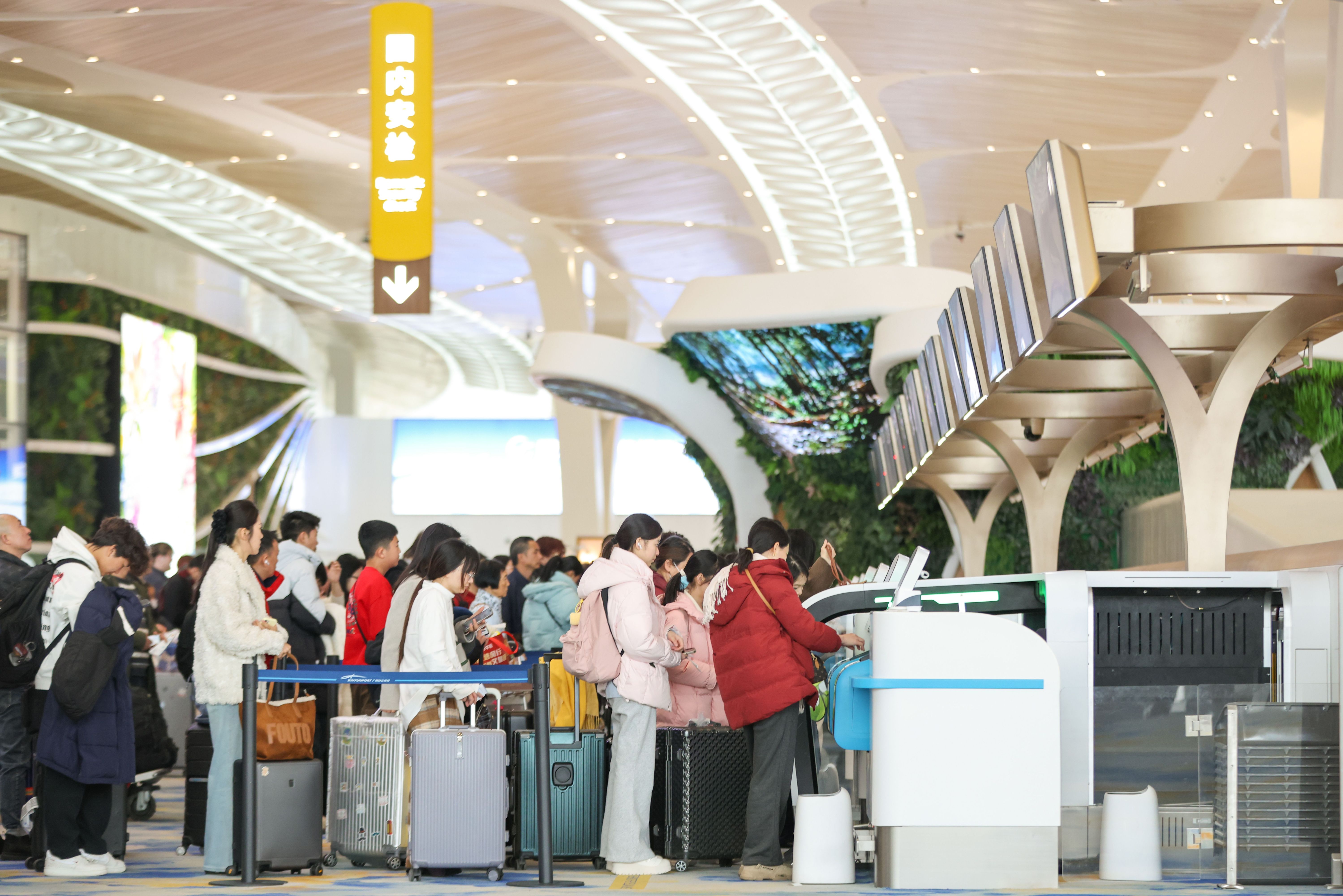 临近年关,在T3航站楼出发大厅里,湖南来粤务工的李先生带着妻儿,在自助机上3分钟办完托运。“第一次走新航站楼,宽敞、亮堂、不用排队,比往年快太多。”他说,今年提前半个月抢到返乡票,一家人带着广式年货回湘过年。